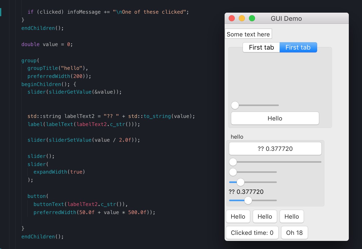 On Mac I finally got the example to run had to brew install glew and glfw3 and change the makefile to point to the include and lib paths. A lot of the interactions don't seem native, for example tap to click doesn't work, I have to do hard clicks on my Mac. Also dragging doesn't seem to work like other apps, it stops dragging if go outside the boundaries of the element. Overall this is pretty epic and I wonder if serious alternatives to XCode and JS based wrappers like Electron are possible.